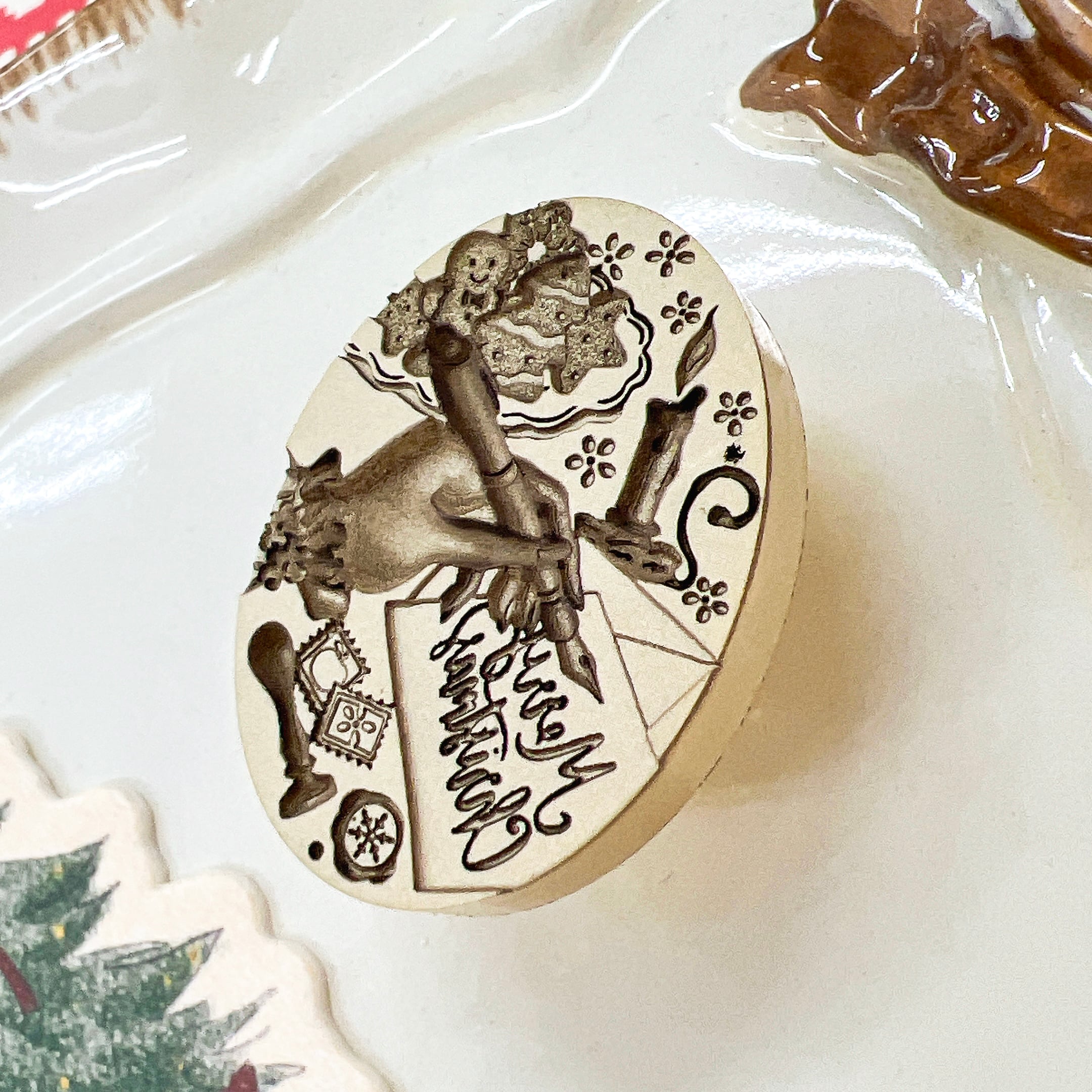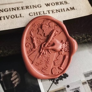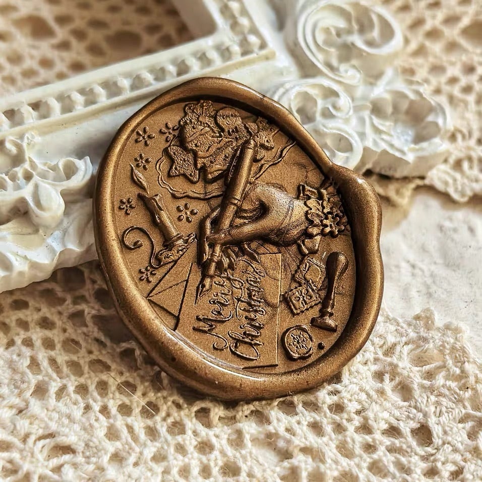 手紙を書くシルエットと “Merry Christmas” の文字が印象的な、クラシカルデザインのシーリングスタンプ。